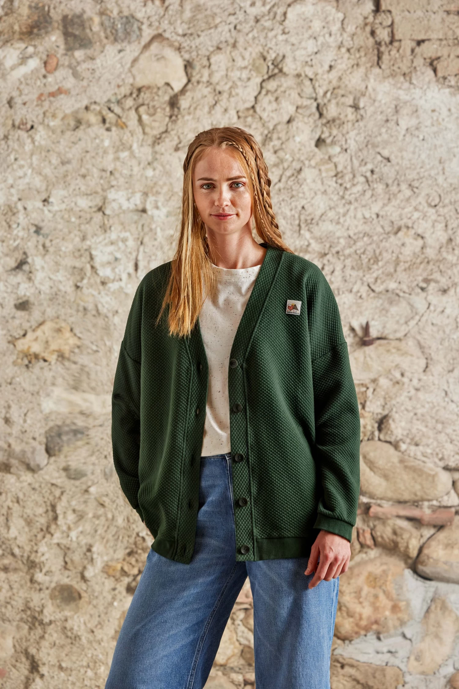 Die geknöpfte maloja FalbenM ist aus Sweat bubble und weit und lässig geschnitten. Die tief angesetzten Ärmel sind am Bündchen gerafft.